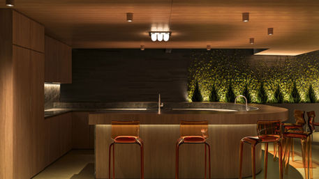 Functionally, the ground floor serves as a service space: a café seating area and a bar counter accessible to both residents and non-residents. Together with the greenery in front, the main entrance is highlighted by a wood-clad surface.